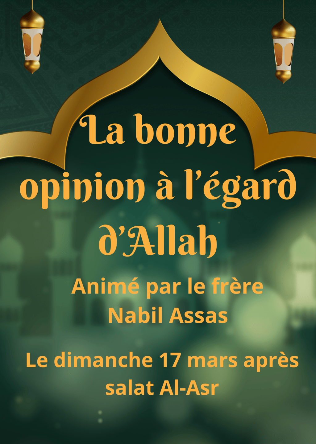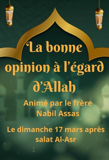 Une conférence exceptionnelle aura lieu le dimanche 17 mars, juste après la prière de Salat Al-Asr. Intitulée "La bonne opinion à l'égard d'Allah", cette session sera animée par le frère Nabil ASSAS. C'est un moment de réflexion profonde sur l'importance de maintenir une perception positive et confiante envers Allah, soulignant comment cette attitude influence positivement notre foi et notre quotidien. À travers des exemples tirés du Coran et de la Sunna, le frère Nabil nous guidera sur le chemin de la confiance en la miséricorde et la sagesse d'Allah, nous invitant à reconsidérer notre relation avec le Créateur sous l'angle de l'optimisme et de l'espoir. Ne manquez pas cette opportunité d'enrichir votre foi et de renforcer votre lien spirituel. Rejoignez-nous dans ce voyage de découverte spirituelle et d'élévation.