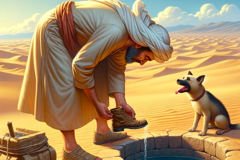Poursuivant son chemin, il tomba sur un petit chien haletant de soif. L'homme s'arrêta, considéra le chien et réfléchit à la manière dont il pourrait l'aider à boire. Il retourna alors au puits avec le chien et commença à remplir sa chaussure d'eau pour la présenter au chien assoiffé, qui but jusqu'à ce qu'il soit rassasié.
