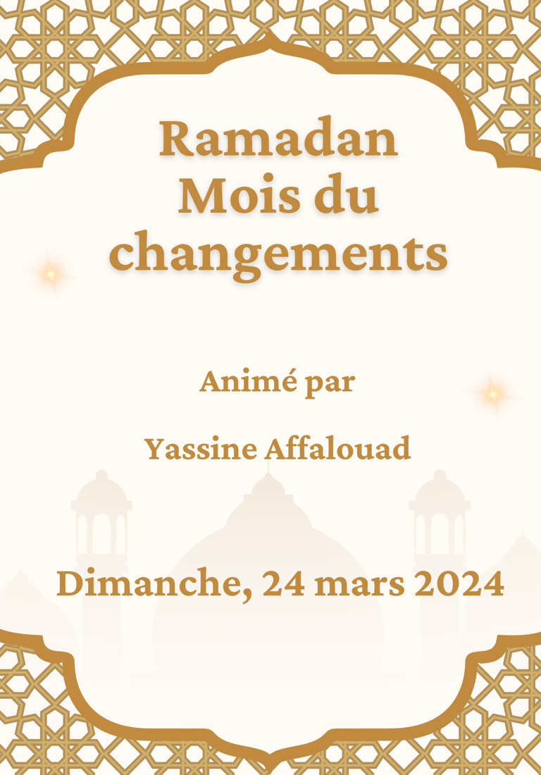 Bienvenue à la conférence "Ramadan : Le Mois des Changements" animée par Yassine Affalouad, qui se tiendra à la mosquée. Rejoignez-nous alors que nous explorons les nombreux aspects de ce mois béni, mettant en lumière ses opportunités de transformation spirituelle, de purification et de croissance personnelle. Ensemble, découvrons comment le Ramadan peut devenir une période de renouveau intérieur et de connexion profonde avec notre foi. Ne manquez pas cette occasion de vous inspirer et de vivre ce mois spécial avec un esprit ouvert et déterminé